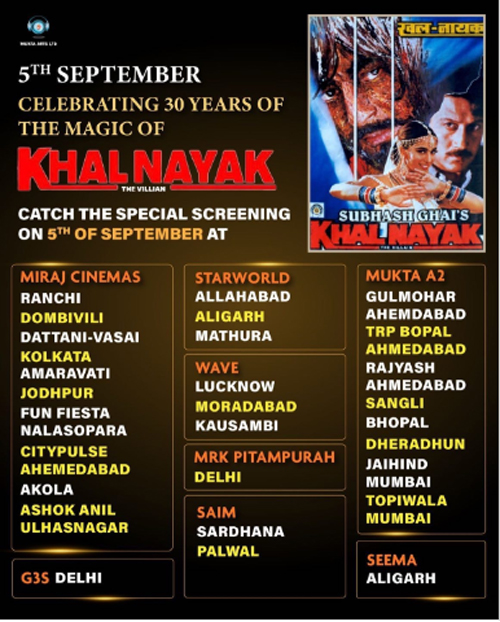 To celebrate 30 years of the film's release, Khalnayak will be screened in 30 theatres across India on September 5. Subhash Ghai shared a post on his Instagram page announcing the details of which theatres will be screening the film in Mumbai and other locations in the country.
