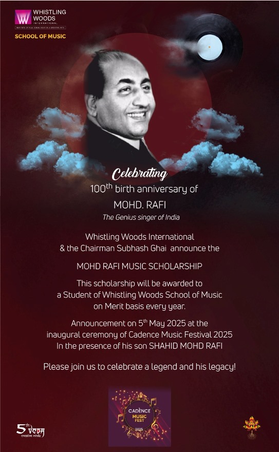 "As India celebrates the 100th birth anniversary of the legendary playback singer Mohammed Rafi, Whistling Woods International (WWI) and its Chairman Subhash Ghai have announced a landmark tribute, The Mohd Rafi Music Scholarship.This prestigious scholarship will be awarded annually to a meritorious student from the Whistling Woods School of Music, honouring the enduring legacy of one of India's greatest musical icons.