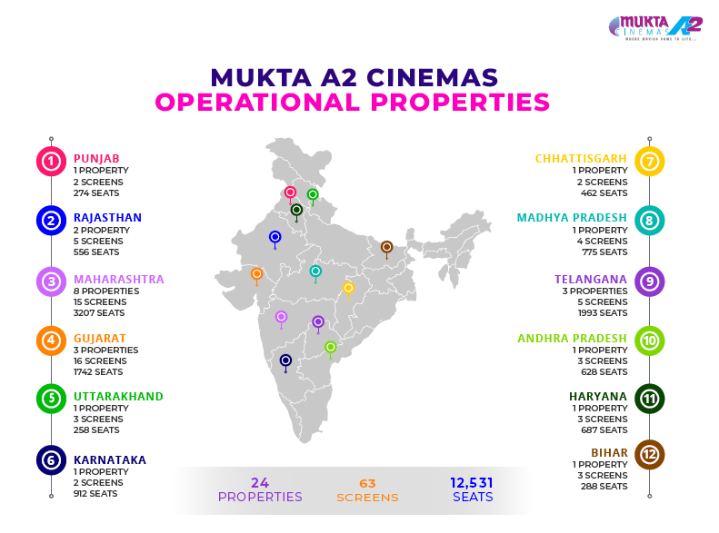 Mukta A2 Cinemas has initiated projects in markets like Pune, Gurgaon, Nainital and other cities, and is also expanding its base in its existing markets including cities like Mumbai, Ahmedabad and Hyderabad.