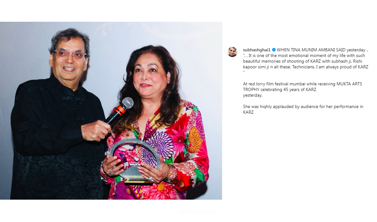 "WHEN TINA MUNIM AMBANI SAID YESTERDAY… “It is one of the most emotional moments of my life with such beautiful memories of shooting KARZ with Subhash ji, Rishi Kapoor, Simi ji, and all these technicians. I am always proud of KARZ.” At Red Lorry Film Festival, Mumbai, while receiving the Mukta Arts Trophy celebrating 45 years of KARZ yesterday, she was highly applauded by the audience for her performance in KARZ." - Subhash Ghai