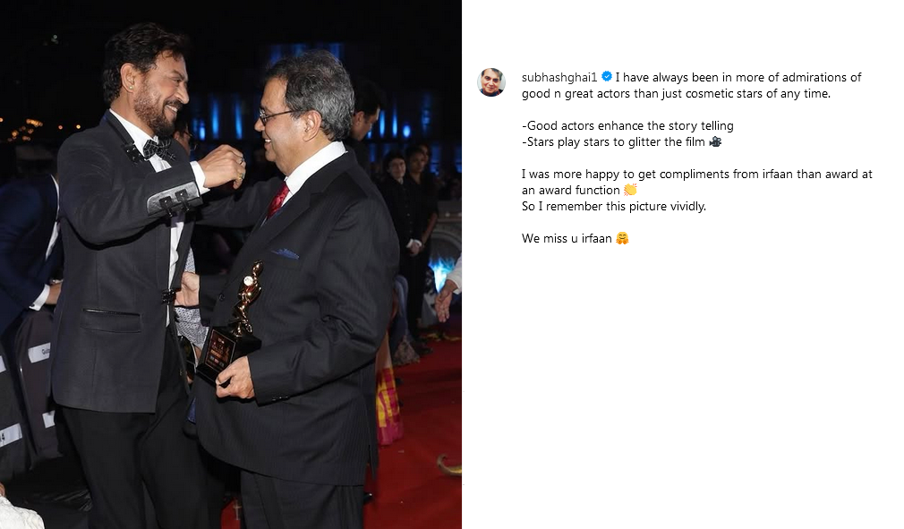 "I have always been more in admiration of good and great actors than just cosmetic stars of any time. Good actors enhance the storytelling — stars play stars to glitter the film. I was more happy to get compliments from Irrfan than to receive an award at an award function. So, I remember this picture vividly. We miss you, Irrfan." - Subhash Ghai