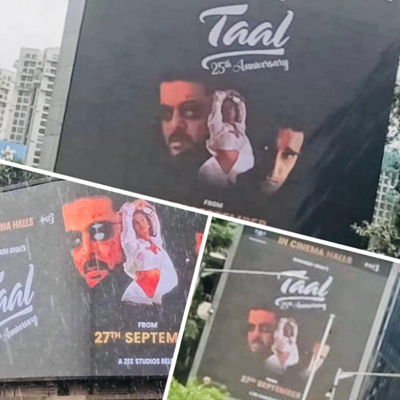 "I CAN'T BELIEVE THAT HOARDINGS OF TAAL WILL REAPPEAR IN MUMBAI AGAIN TO MARK ITS 25TH ANNIVERSARY AND THE RE-RELEASE OF TAAL FROM TOMORROW IN 136 THEATRES ON PUBLIC DEMAND. It will be a new experience for the younger generation to watch a pure musical motion picture made in 1999, with super performances by ANIL KAPOOR, AISHWARYA RAI, and AKSHAYE KHANNA, along with a musical classic by A.R. RAHMAN. Congratulations TEAM TAAL and bless you always." - Subhash Ghai