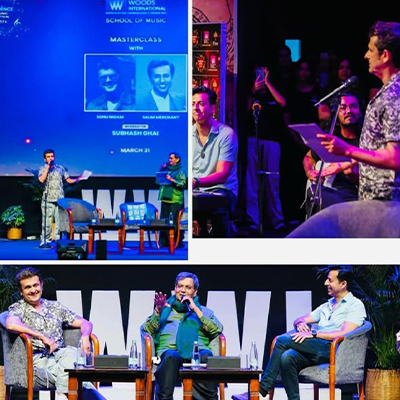 "Two superstars in the Indian music world who started their careers with Divine Music shared their experience were Sonu Nigam and Salim Merchant. No talent can nurture without praying to the universe: “We always start our recording by bowing to our Almighty and we get charged.” Both masters revealed to students at Whistling Woods yesterday at Cadence Music Festival 2026 with the theme Divine Jammers and inspired students to sing with them impromptu and brought ecstasy." - Subhash Ghai
